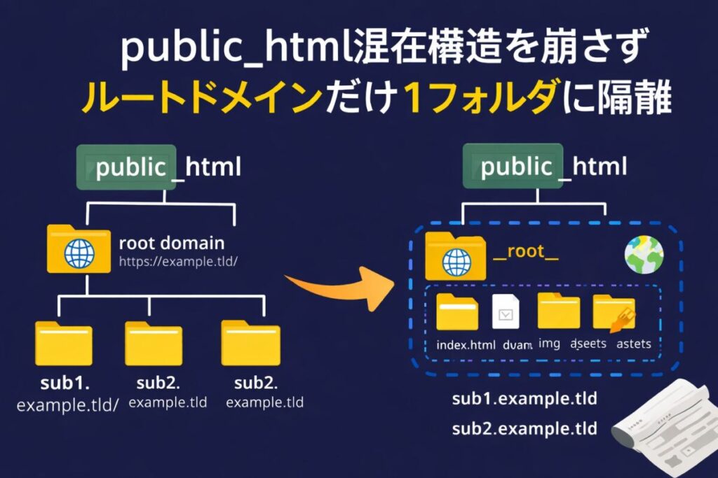 Xserver(レンタルサーバー)のpublic_html混在構造を崩さず、ルートドメインだけ1フォルダに隔離する方法(Host条件Rewrite)