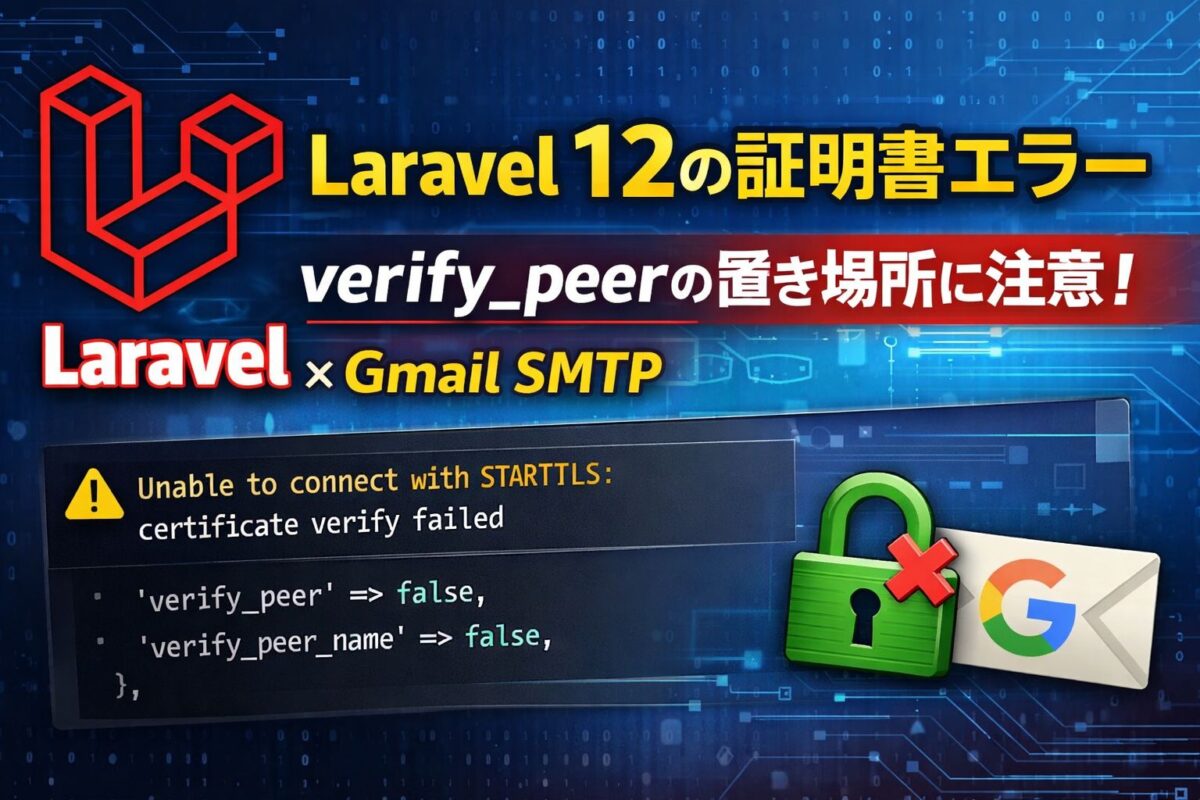 .env には Gmail SMTP を設定済み(例:MAIL_HOST=smtp.gmail.com / MAIL_PORT=587 / MAIL_ENCRYPTION=tls)でしたが、開発環境で一時的に MAIL_VERIFY_PEER=false を入れても改善しませんでした。結論から言うと、Laravel 12 では verify_peer / verify_peer_name を「SMTP設定の直下」に置かないと参照されないのが原因でした。